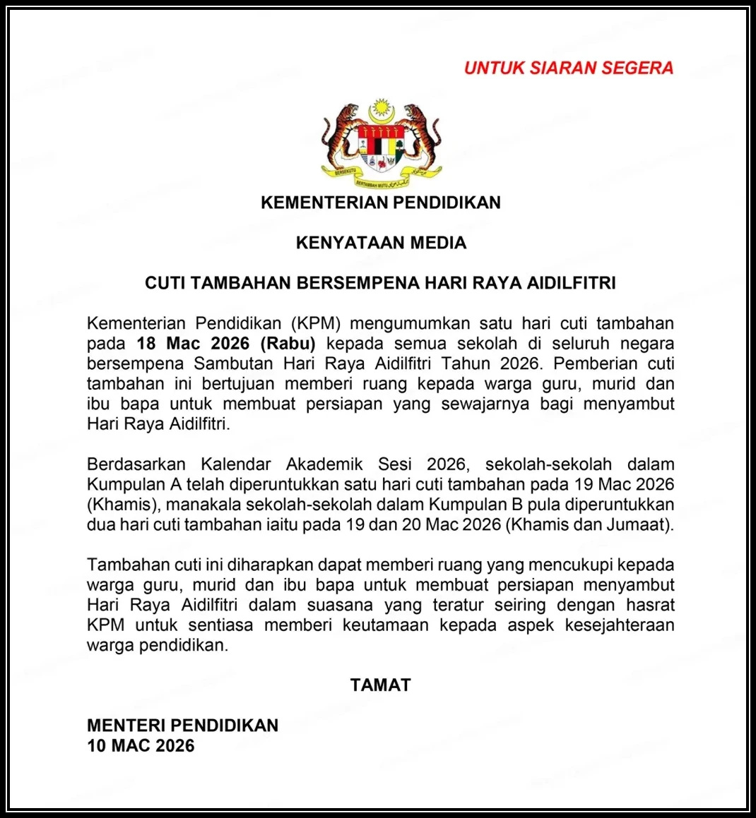 Cuti Tambahan Bersempena Hari Raya Aidilfitri Tahun 2026